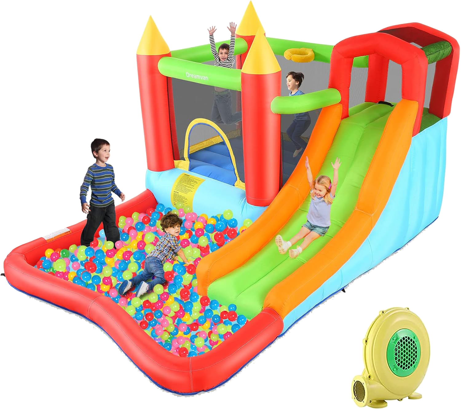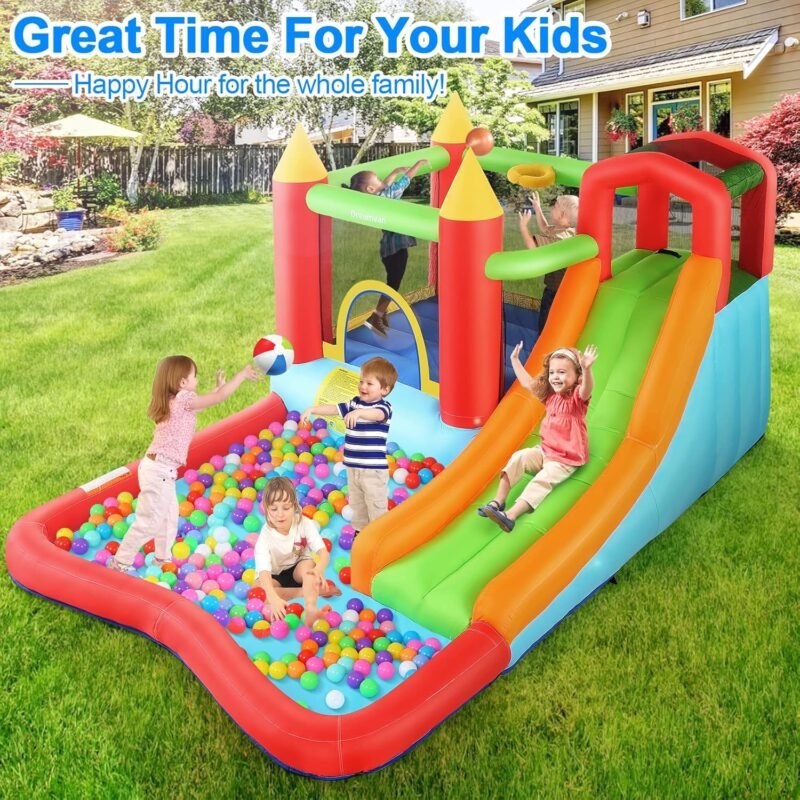Inflatable Bounce House with Blower – Ages 3-12, Outdoor/Indoor Water Park with Slide, Climbing Wall, Ball Pit, Jumping Area